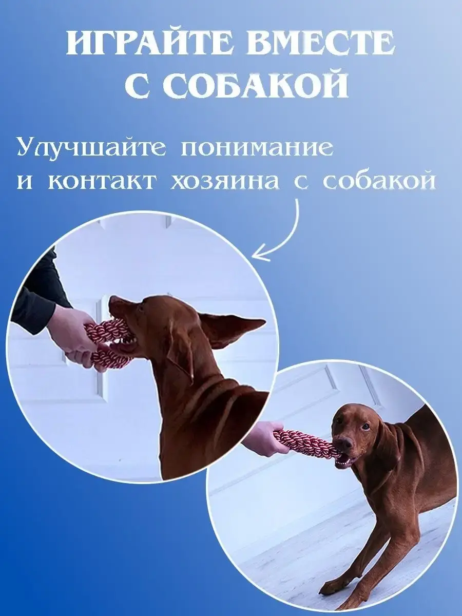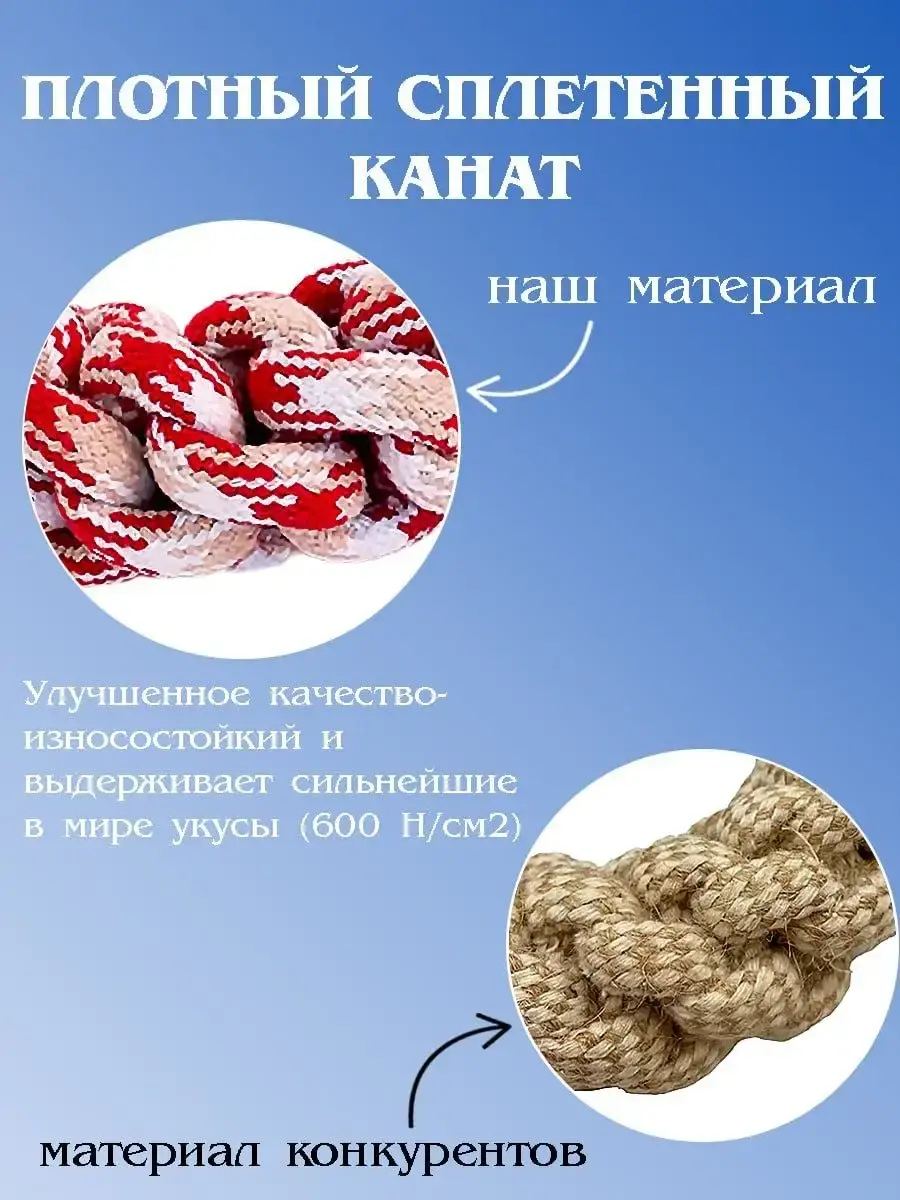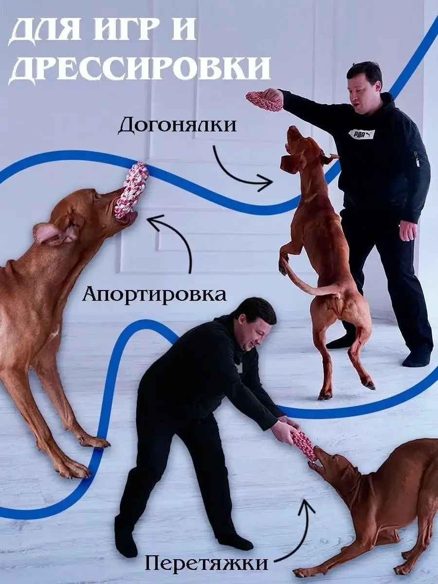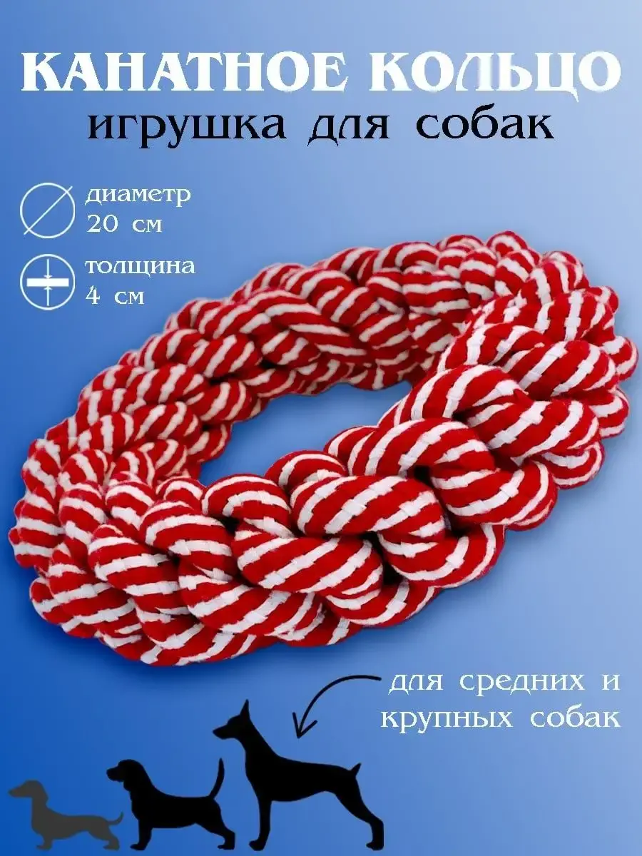 Канатное кольцо для собак средних и крупных пород - безопасная игрушка для развлечения и развития Вашего питомца! Используется при дрессировке, обучения команд, апортировки, перетягивании, догонялки, тренировки и развития прикуса собаки. Диаметр 20 см с прочным плетением из экологичного хлопкового материала - гипоаллергенного, некрасящего, с увеличенной толщиной нити канатика. Эта антистресс кусалка полезная для десен собаки и очищения зубов от зубного налета. Эту развивающую игрушку из веревки можно использовать как пуллер, фрисби, канат, грейфер, тарелку, кольцо для прыжков, развивающие ловкость и скорость животного. Предостережение: игрушка строго для интерактивного взаимодействия собаки с хозяином. Не оставляйте собаку наедине с веревочным кольцом, т.к. это не грызак - собака вытянет нити и игрушка придет в негодность. См. полный каталог игрушек, ухваток и рукавов для дрессировки собак по клику на бренд “Друг человека”