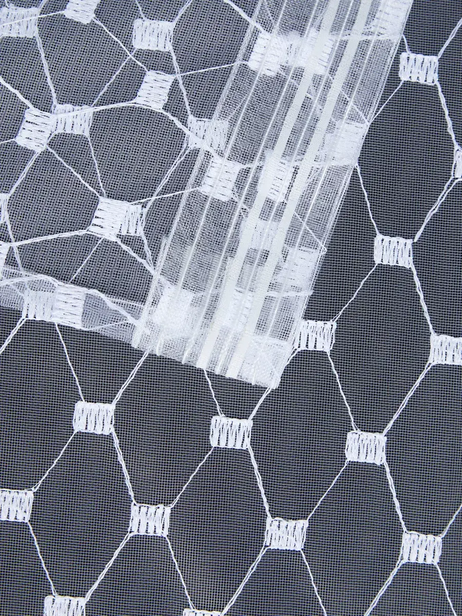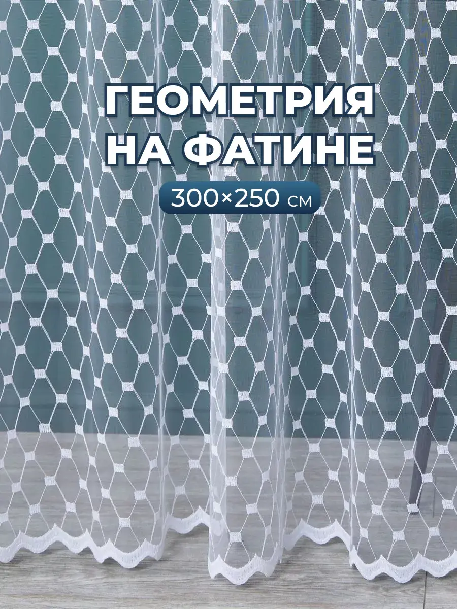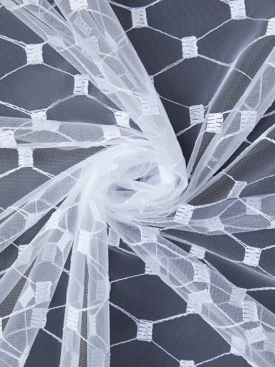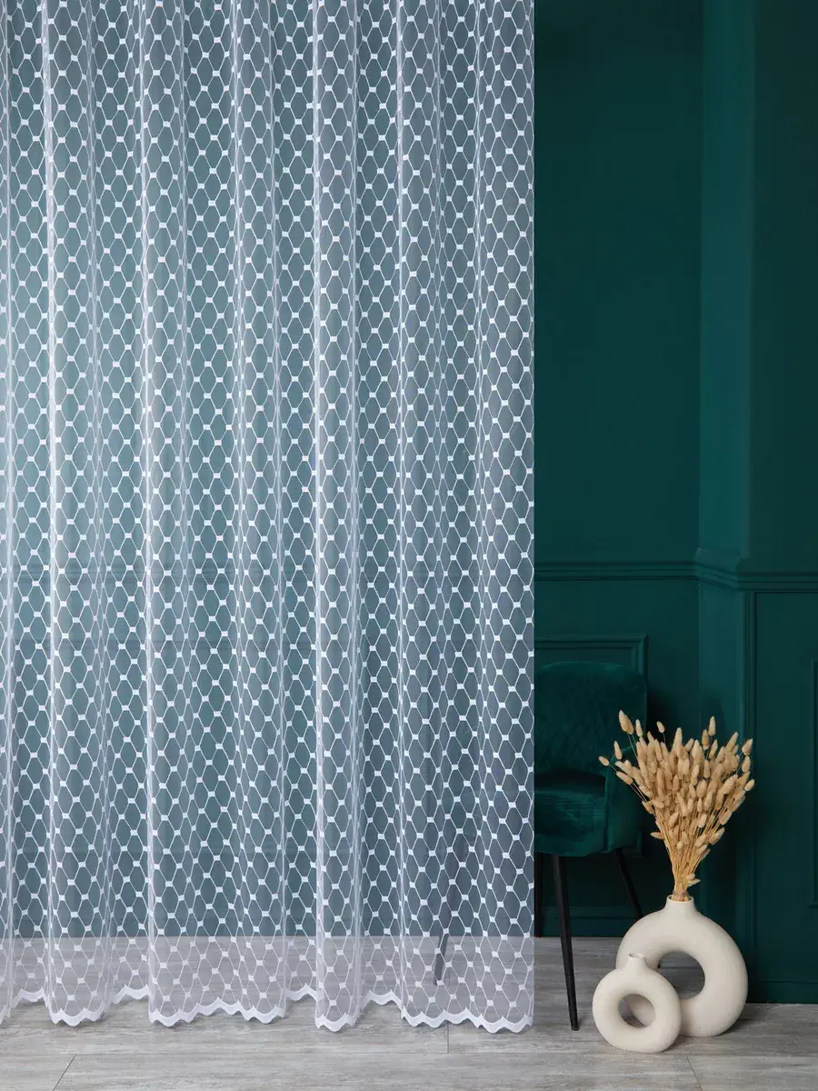 Стильный тюль с геометрическим узором преобразит интерьер Вашего помещения. Белоснежная занавеска на основе аутентичной турецкой сетчатой ткани за счет вышивки нитью с добавлением люрекса обладает легким едва заметным мерцанием и переливами. Сетка отличается однородным окрасом по всему полотну, не деформируется после стирки, как вуаль пропускает воздух и мягко рассеивает солнечный свет, освежает комнату - делает ее просторнее и светлее.
