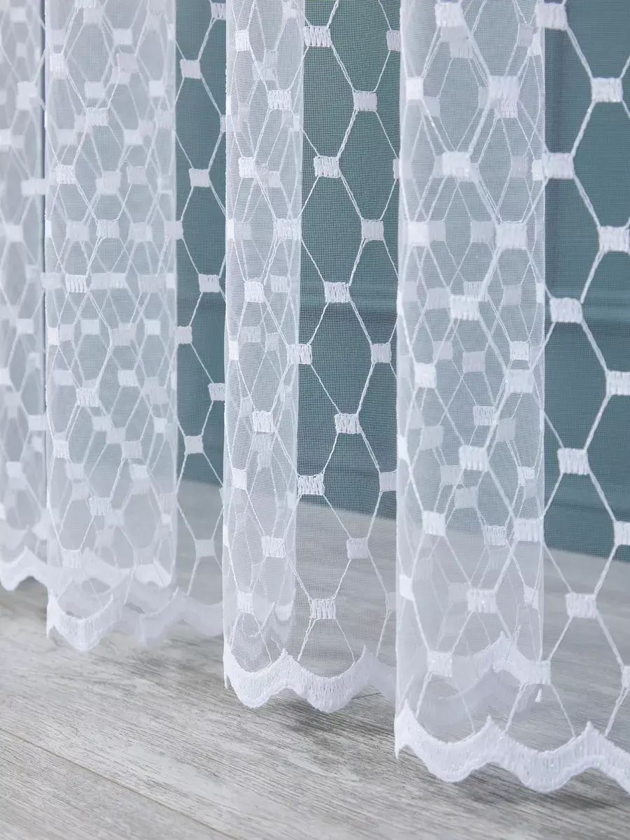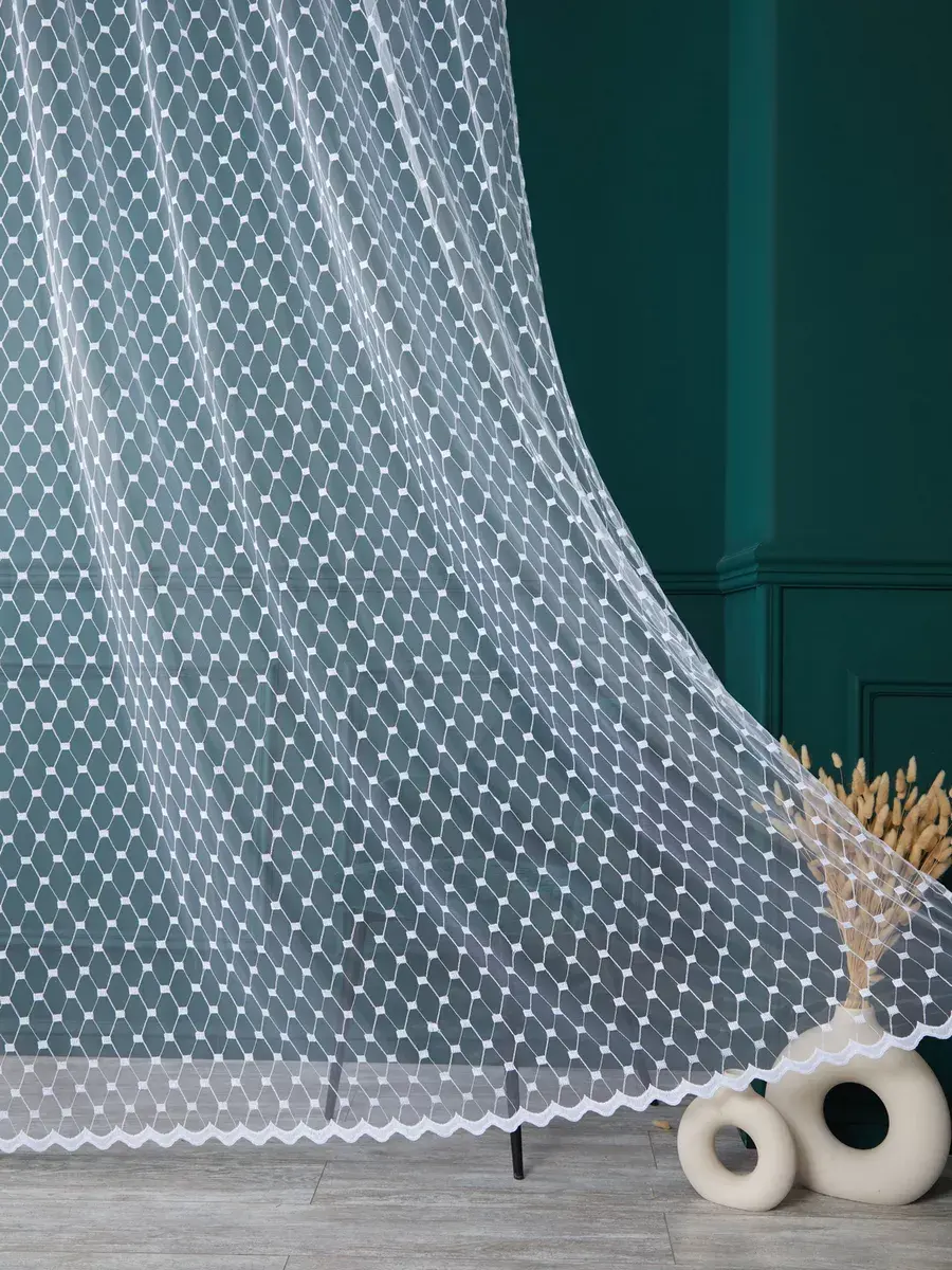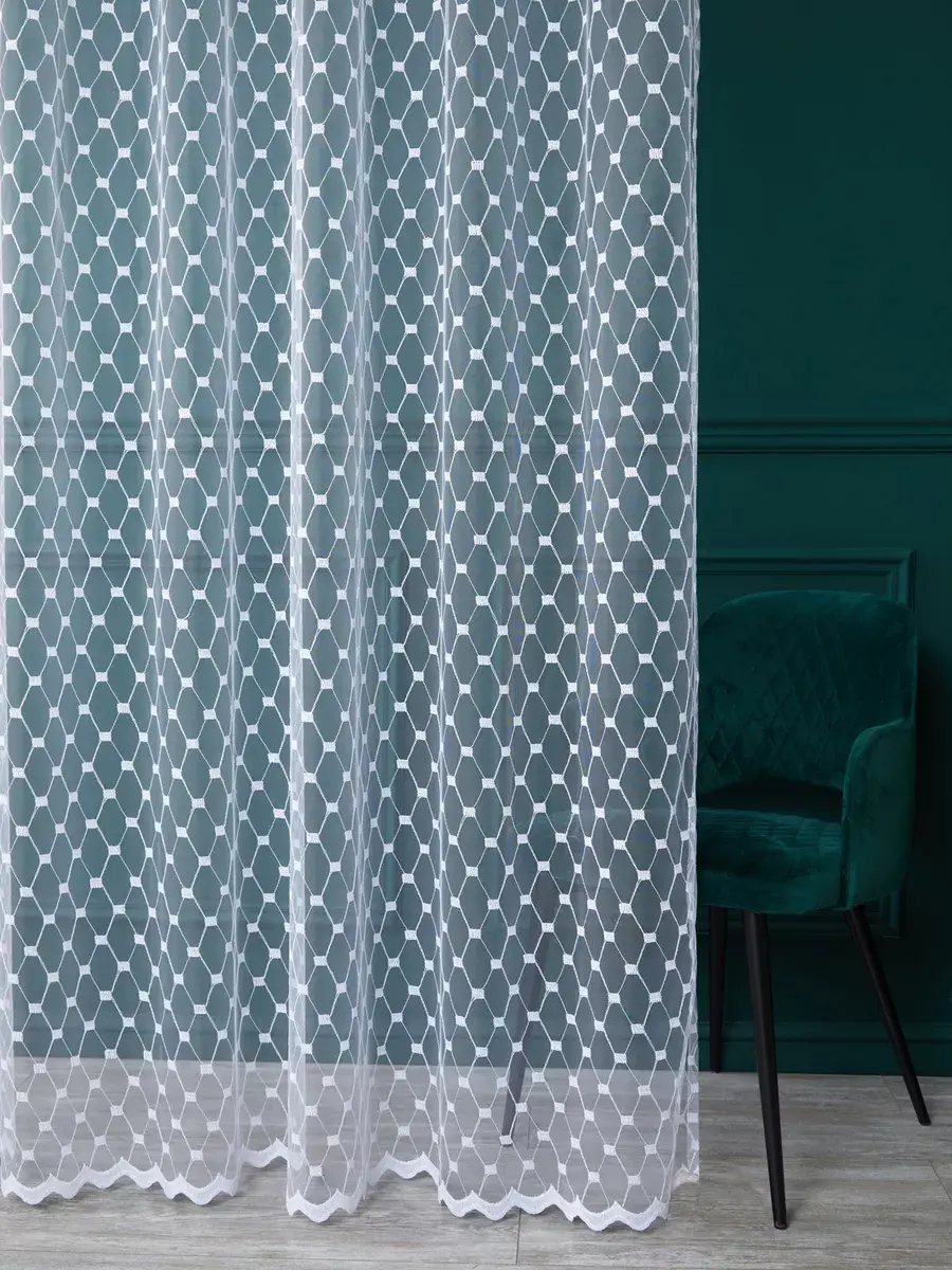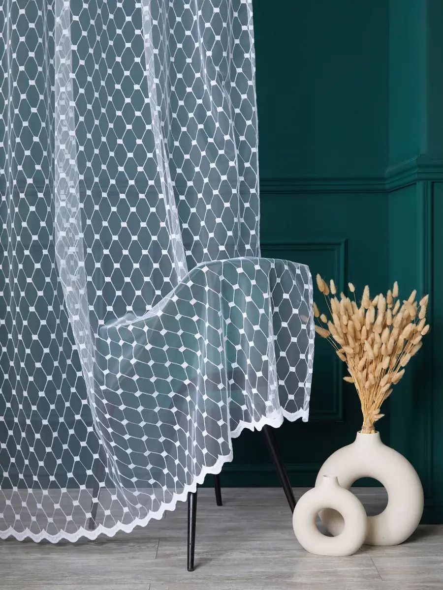 Привлекает внимание красивый дизайн вышитого рисунка в виде чередующихся ромбов и квадратов, которые вместе с волнистой каймой создают необычный и эстетичный образ гардины. Вышивка на канте также выполняет функцию утяжелителя.