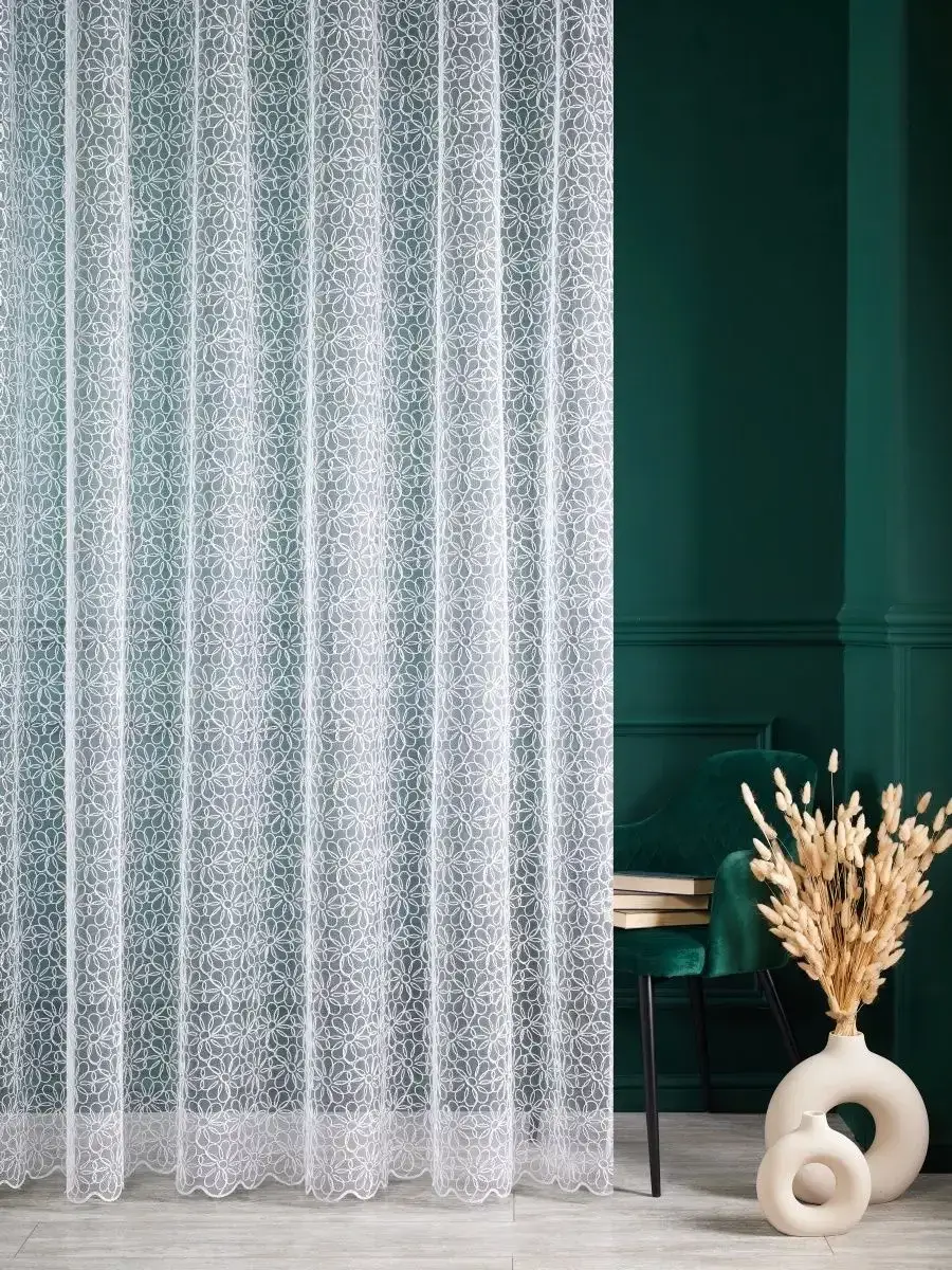 Шикарный стильный тюль с узором Ромашки идеально преобразит современный дизайн интерьера. Готовая длинная занавеска размер полотна 280х300 см (высота 280см, ширина 300см) смотрится нарядно и создает уютную атмосферу в доме и на даче: гостиной или зале, спальне и кухне, детской комнате девочки или мальчика и даже на балконе. Также вы можете сделать детский балдахин. Подойдет для украшения и декораций любых мероприятий – свадеб, школ, в класс и детских садов. Тюль вуаль изготовлен из высококачественной люксовой турецкой ткани сахарной белизны (şeker beyazı). Рисунок на сетке вышит кордовой нитью с люрексом, из-за чего занавеска воспринимается объемной и роскошной. Швы абсолютно ровные, а изделие не имеет никаких затяжек. Присборенные полупрозрачные тюли празднично и красиво смотрятся как с простой однотонной шторой, так и с цветными занавесками. Крепление вуали возможно широкой прозрачной шторной лентой 6 см с двумя рядами петель на крючки, кольца, или надевается на трубу. Для легкой драпировки предусмотрены четыре направляющие шнура. Комнатный тюль можно стирать в деликатном режиме при температуре 30 градусов без отжима и отбеливания. Гладить штору не обязательно – ее можно повесить на карниз все складки и заломы расправятся самостоятельно под тяжестью изделия. Yulata производит непревзойденный тюль для вашего дома! Это доказывают восторженные отзывы наших покупателей. Актуальная и модная новинка 2024 года продается с большой скидкой по акции для продвижения нового бренда. Приятных покупок!