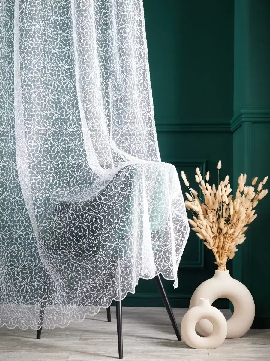 Шикарный стильный тюль с узором Ромашки идеально преобразит современный дизайн интерьера. Готовая длинная занавеска размер полотна 240х400 см (высота 240см, ширина 400см) смотрится нарядно и создает уютную атмосферу в доме и на даче: гостиной или зале, спальне и кухне, детской комнате девочки или мальчика и даже на балконе. Также вы можете сделать детский балдахин. Подойдет для украшения и декораций любых мероприятий – свадеб, школ, в класс и детских садов. Тюль вуаль изготовлен из высококачественной люксовой турецкой ткани сахарной белизны (şeker beyazı). Рисунок на сетке вышит кордовой нитью с люрексом, из-за чего занавеска воспринимается объемной и роскошной. Швы абсолютно ровные, а изделие не имеет никаких затяжек. Присборенные полупрозрачные тюли празднично и красиво смотрятся как с простой однотонной шторой, так и с цветными занавесками. Крепление вуали возможно широкой прозрачной шторной лентой 6 см с двумя рядами петель на крючки, кольца, или надевается на трубу. Для легкой драпировки предусмотрены четыре направляющие шнура. Комнатный тюль можно стирать в деликатном режиме при температуре 30 градусов без отжима и отбеливания. Гладить штору не обязательно – ее можно повесить на карниз все складки и заломы расправятся самостоятельно под тяжестью изделия. Yulata производит непревзойденный тюль для вашего дома! Это доказывают восторженные отзывы наших покупателей. Актуальная и модная новинка 2024 года продается с большой скидкой по акции для продвижения нового бренда. Приятных покупок!